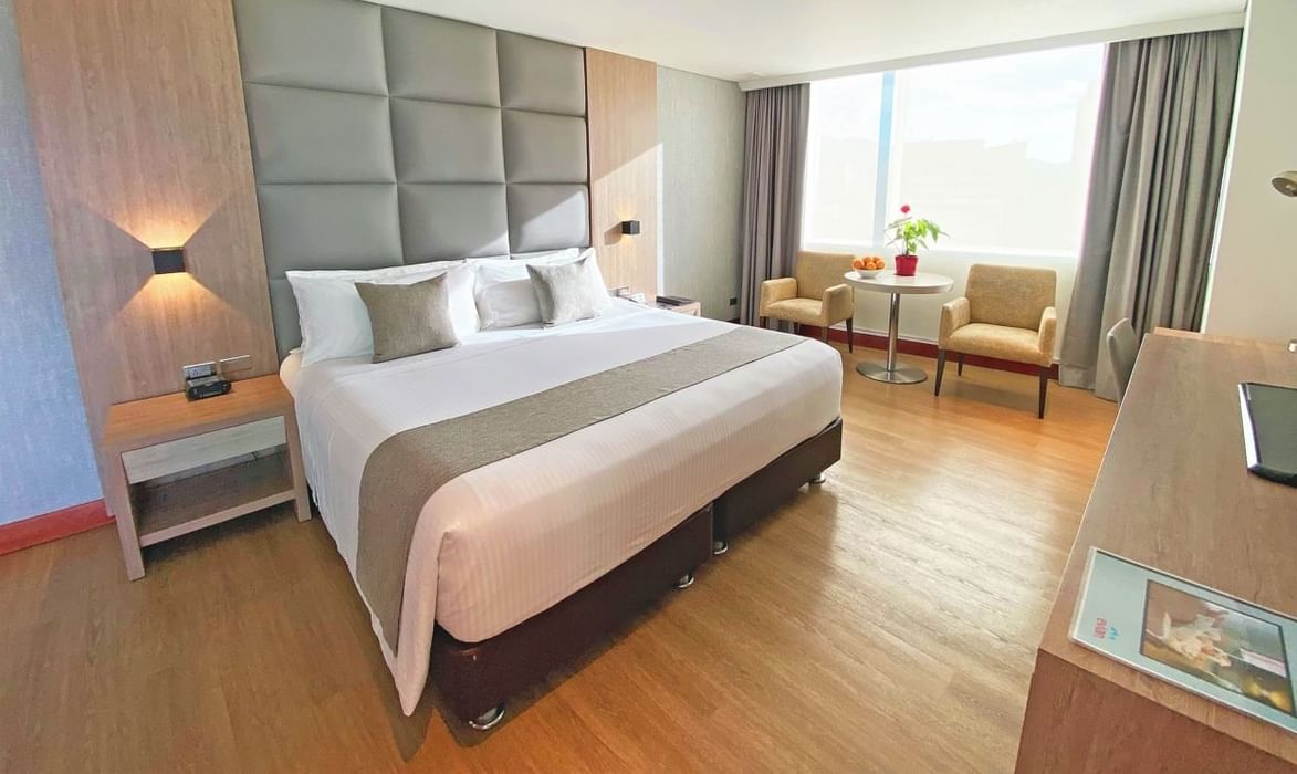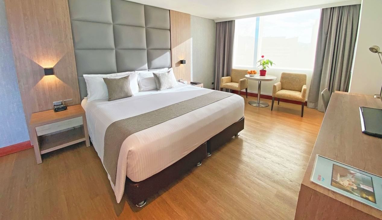 Para el máximo capricho, nuestra Suite Presidencial en la última planta cuenta con una decoración especial, una espaciosa zona de estar, comedor y una terraza con impresionantes vistas al Valle de Aburra.